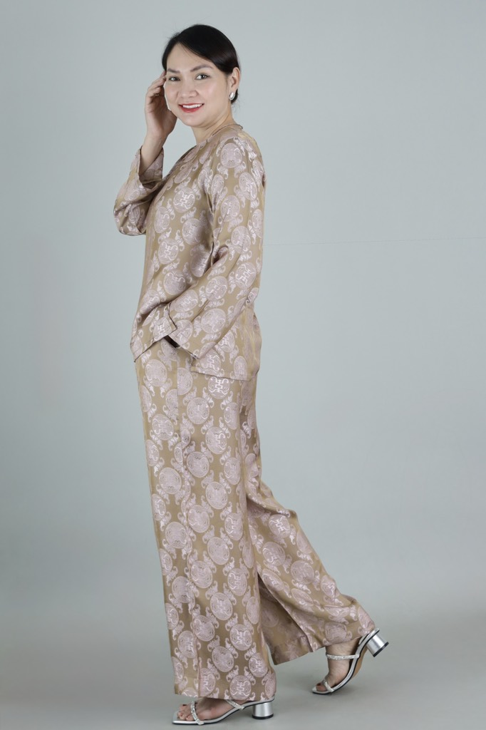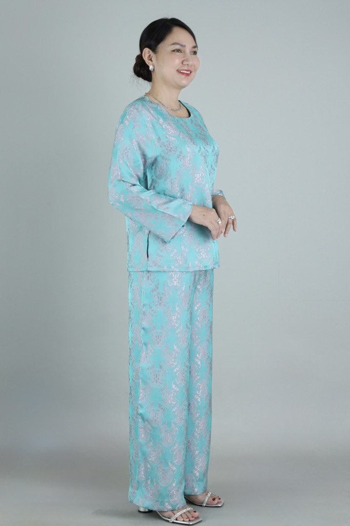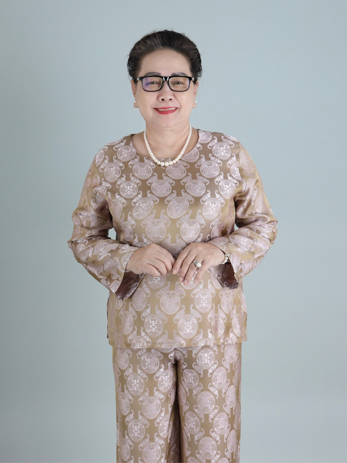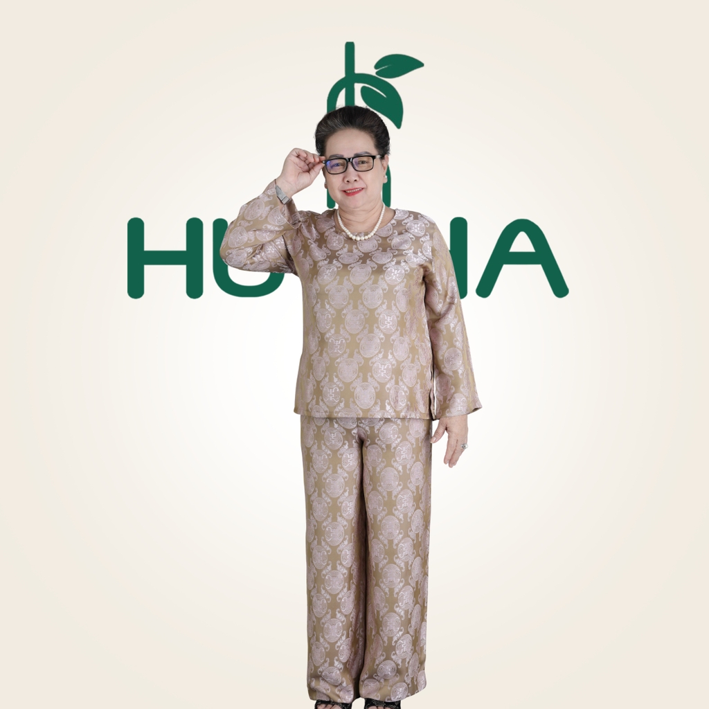 Đồ bộ được may từ lụa tầm Nha Xá cao cấp, bề mặt ánh nhẹ, họa tiết nổi tinh tế, giúp tôn lên vẻ quý phái, nhẹ nhàng của người phụ nữ trung niên.