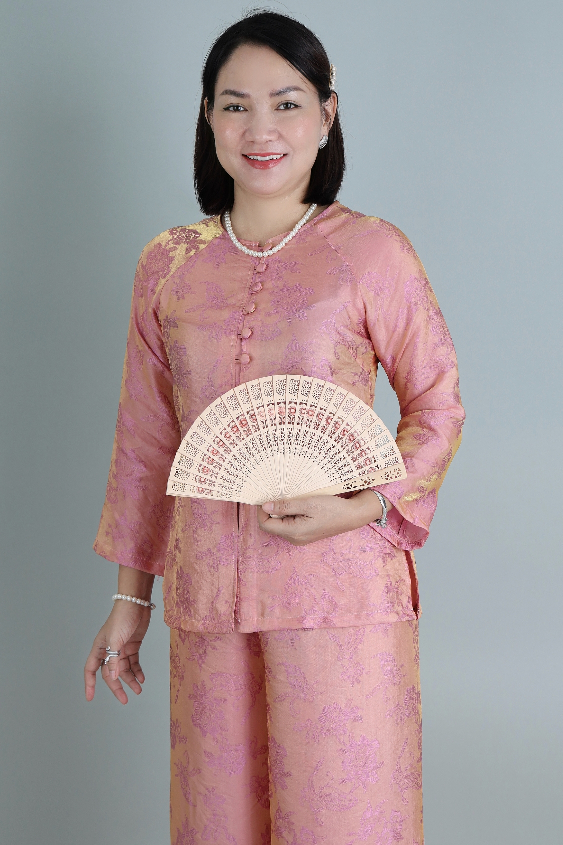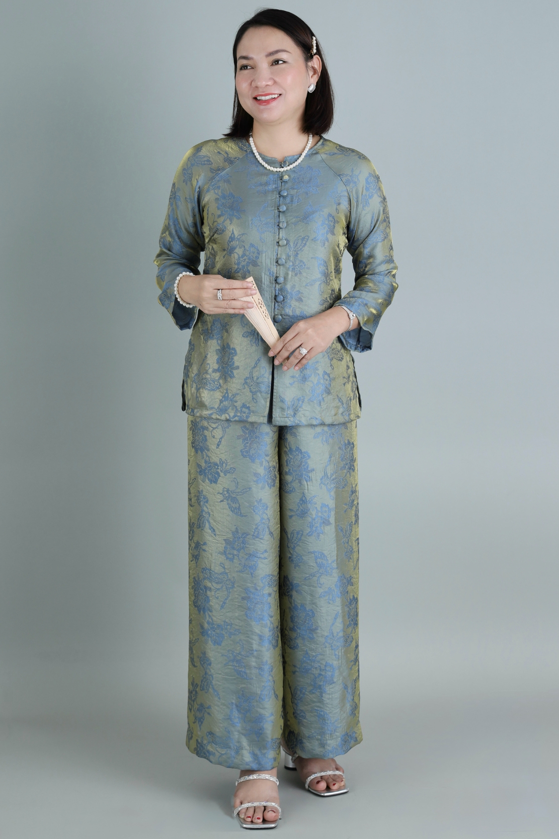 • Kiểu dáng: Áo cổ tròn, cài nút truyền thống - Quần ống rộng